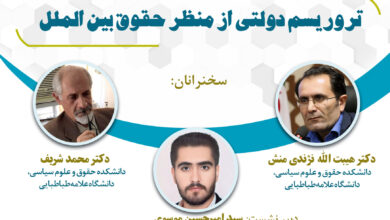 -      نشست “تروریسم دولتی از منظر حقوق بین الملل” برگزار می شوددانشکده حقوق و علوم سیاسی دانشگاه علامه طباطبائی با همکاری انجمن دفاع از قربانیان تروریسم، نشستی با عنوان تروریسم… بیشتر بخوانید »