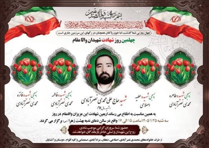 لازم به ذکر است، مراسم چهلمین روز شهادت شهیدان، بسیجی شهیده طاهره محمدی نصرآبادی و بسیجی شهیده عطیه اصلاحی و بسیجی شهیده فاطمه محمدی نصرآبادی و بسیجی شهیده فائزه محمدی نصرآبادی در روز سه شنبه 1405/01/25 از ساعت 15 الی 17 واقع در سالن دعای ندبه بهشت زهرا (س) برگزار میگردد.حضور شما سروران گرامی موجب شادی روح آن شهیدان والا مقام وتسلی خاطر بازماندگان خواهد شد.